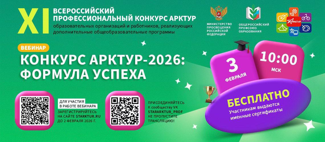 Торопитесь - уже 3 февраля пройдет вебинар «Формула успеха» для образовательных организаций и работников, реализующих дополнительные общеобразовательные программы — настоящих и будущих участников Всероссийского профессионального конкурса «Арктур». (https://vk.com/stararktur_prof)