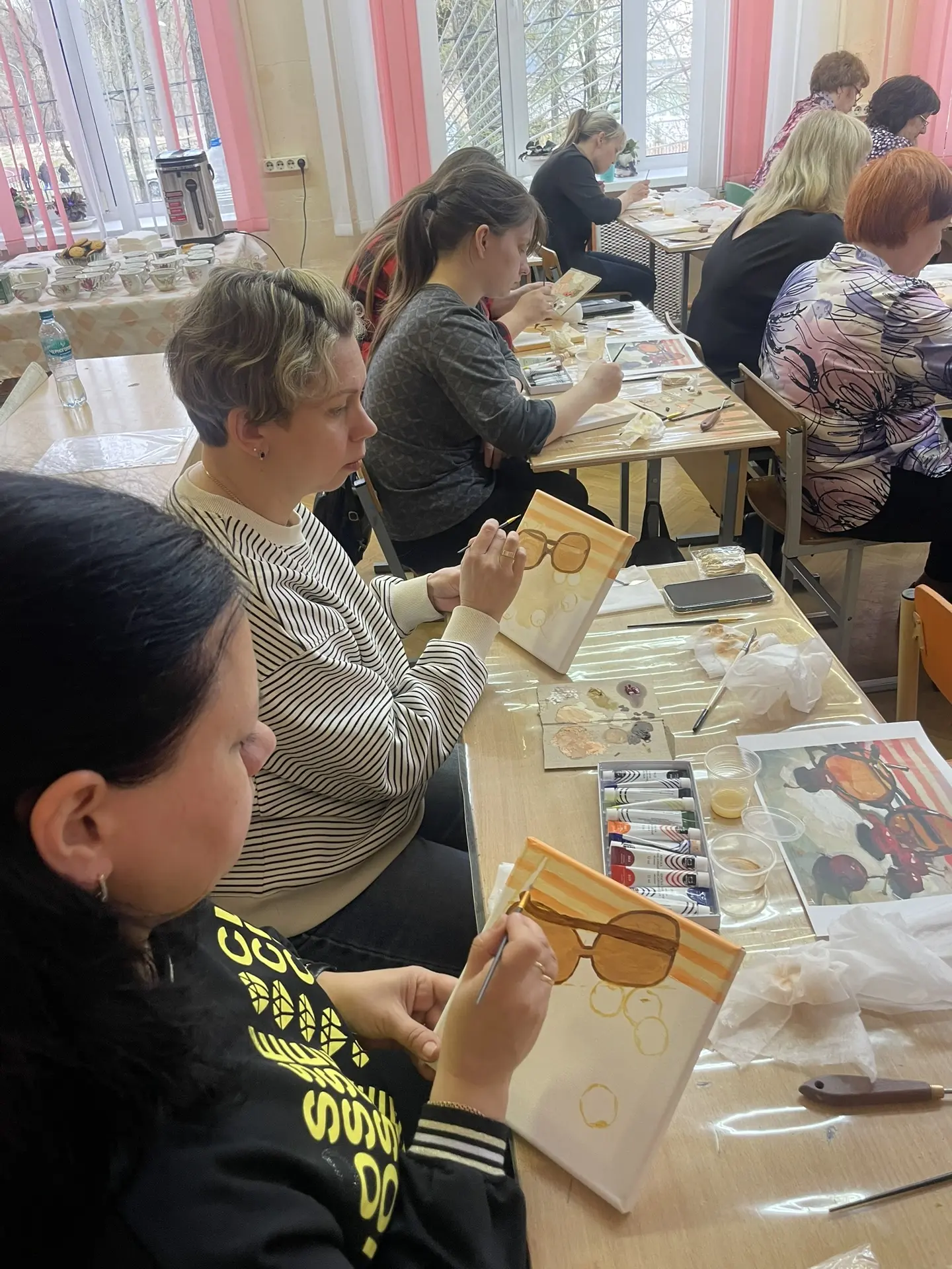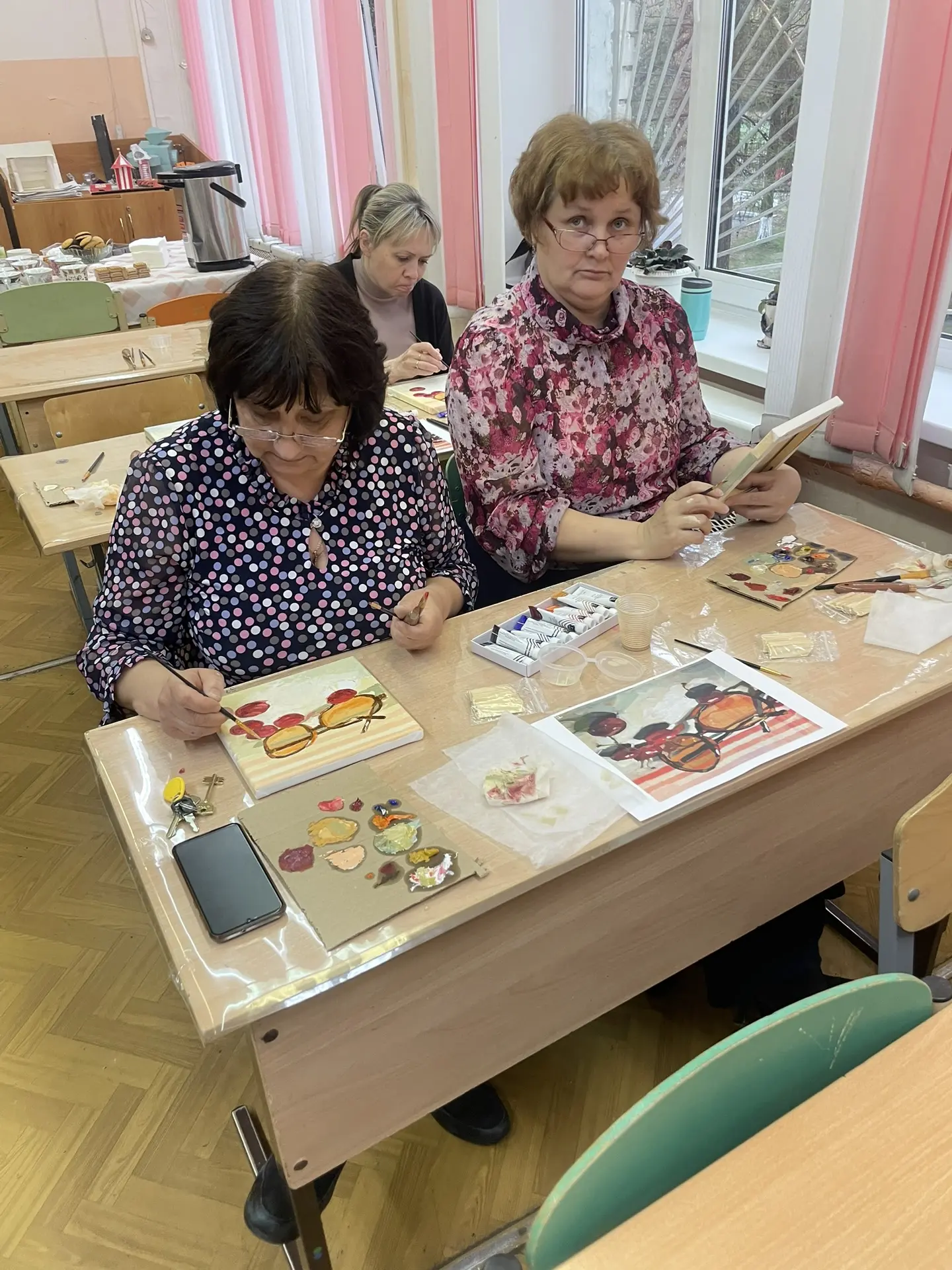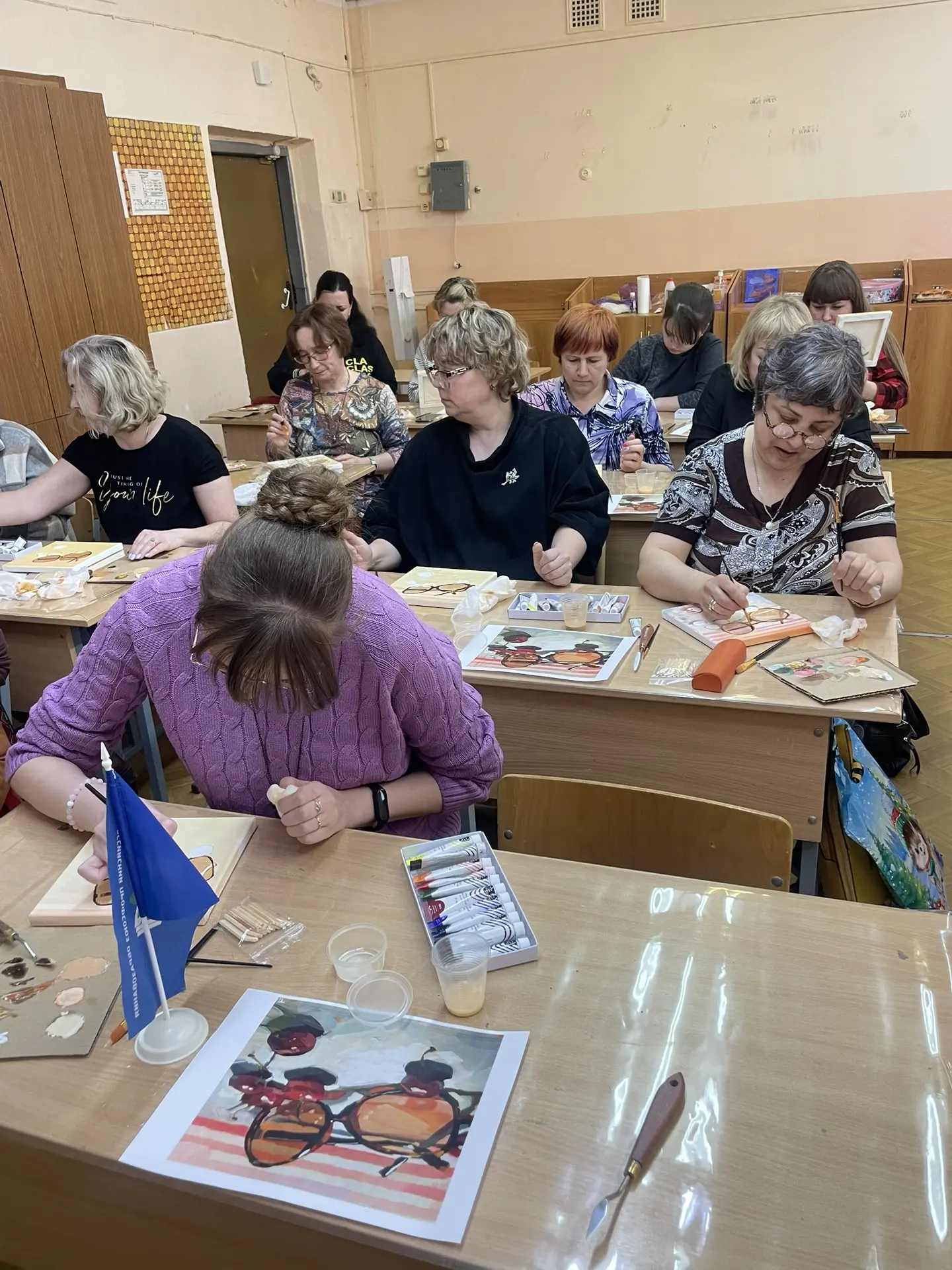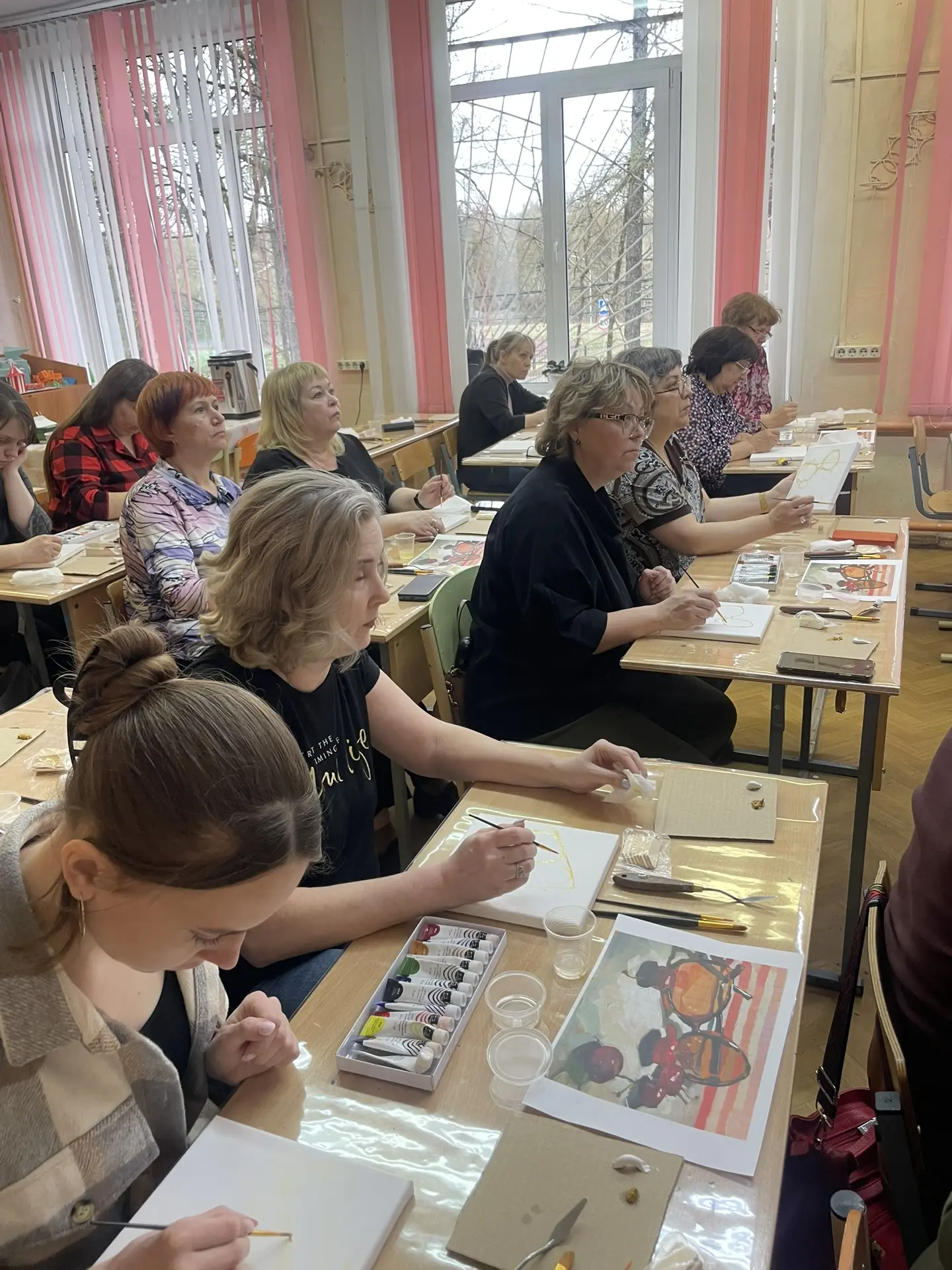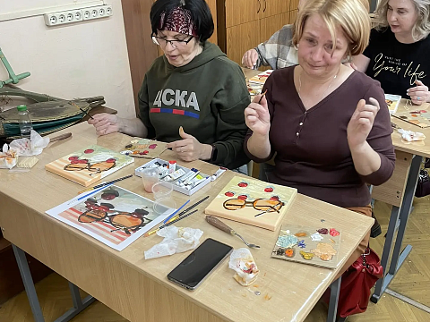 По многочисленным просьбам 15 апреля школа 38 вновь собрала членов профсоюза на гостевание "Женские радости". Тверская городская организация приготовила для встречи: холсты, масляные краски, кисти, короче, всё необходимое, входят участники. Кто-то из участников знаком с коллегами из других образовательных учреждений, а кто-то пришёл впервые, но атмосфера комфортная и доброжелательная.