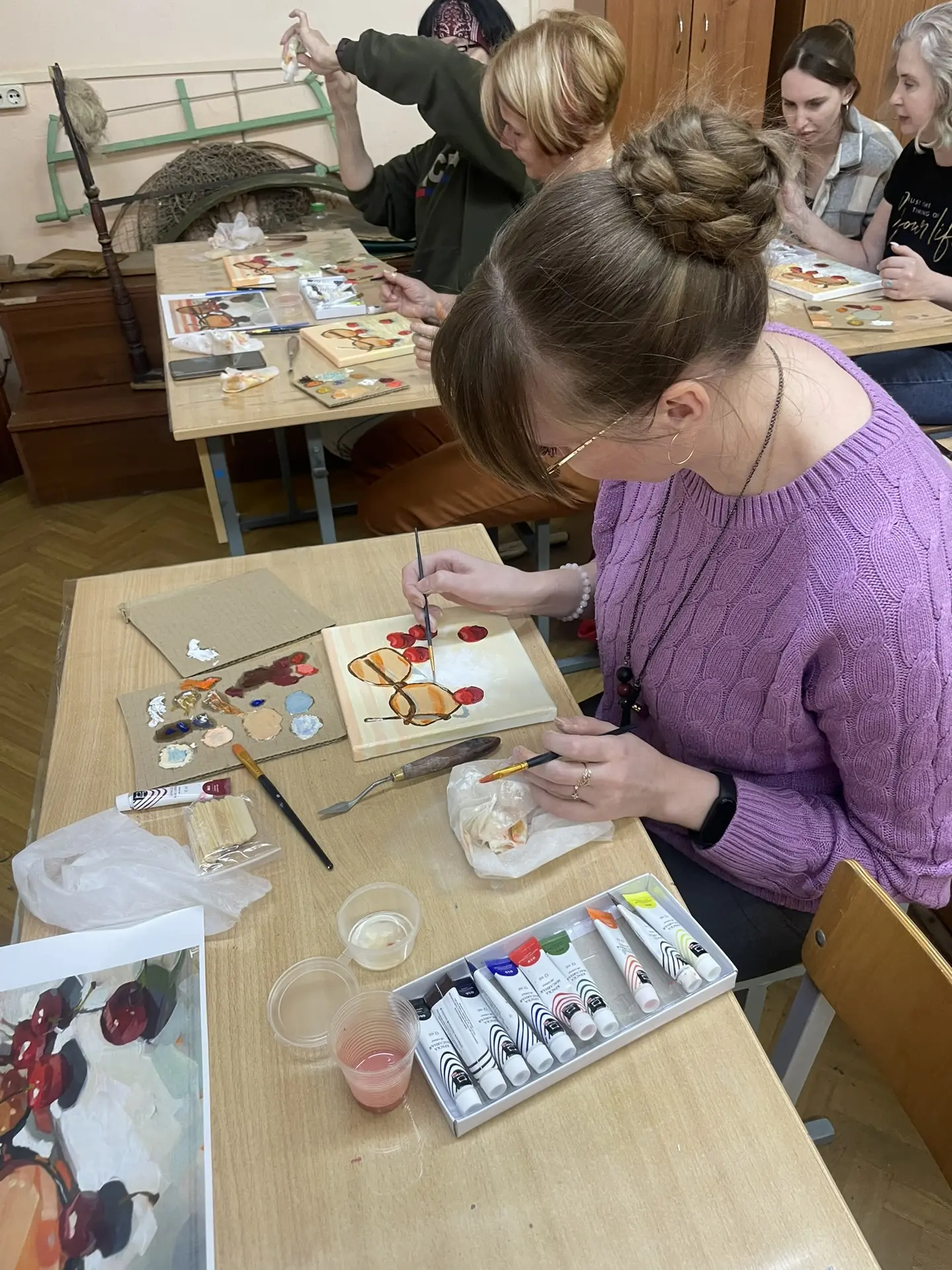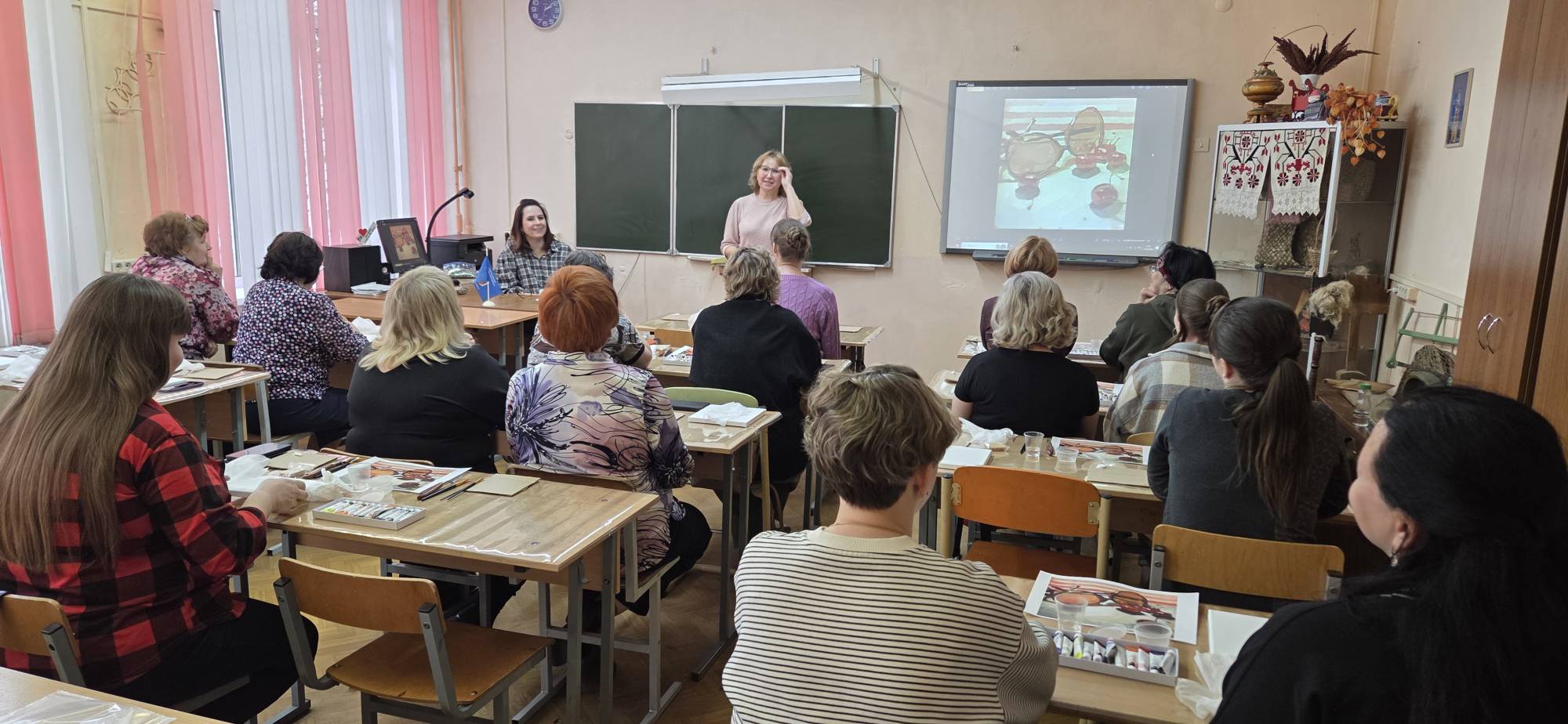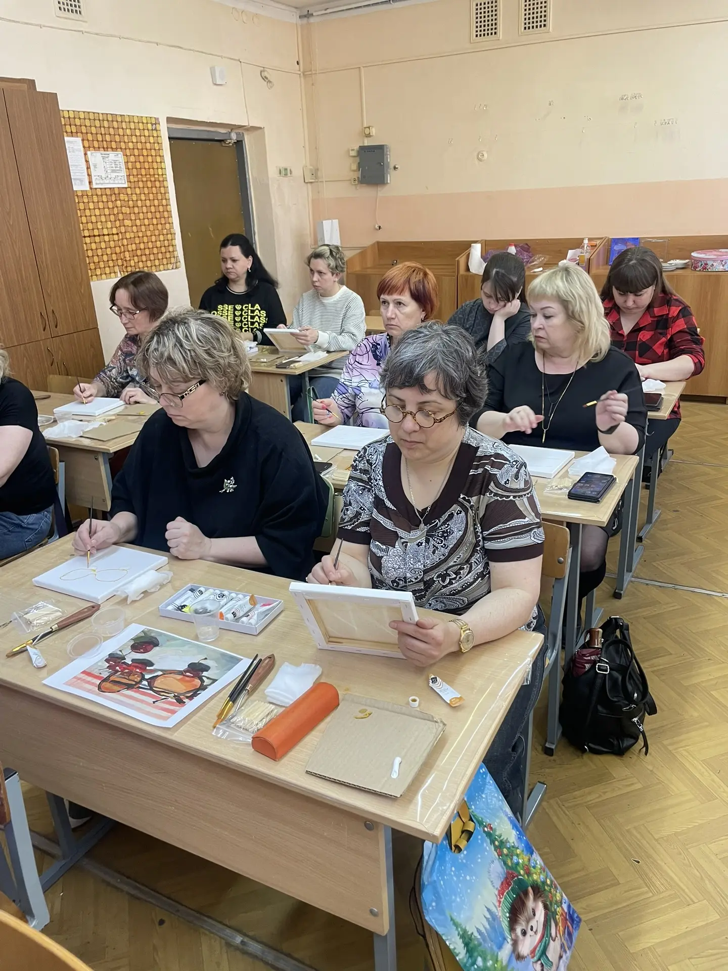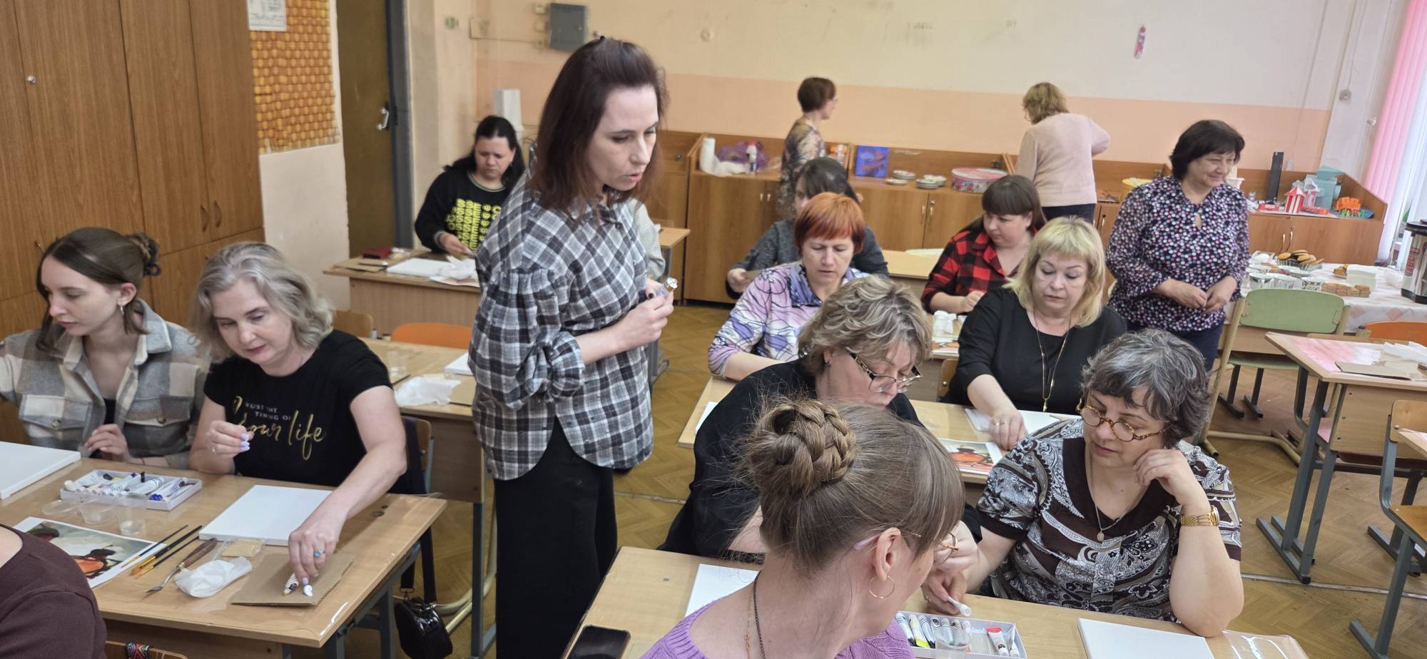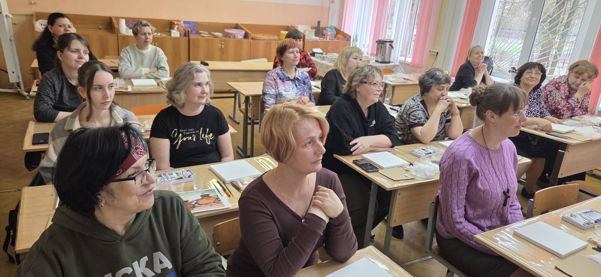 По многочисленным просьбам 15 апреля школа 38 вновь собрала членов профсоюза на гостевание "Женские радости". Тверская городская организация приготовила для встречи: холсты, масляные краски, кисти, короче, всё необходимое, входят участники. Кто-то из участников знаком с коллегами из других образовательных учреждений, а кто-то пришёл впервые, но атмосфера комфортная и доброжелательная.