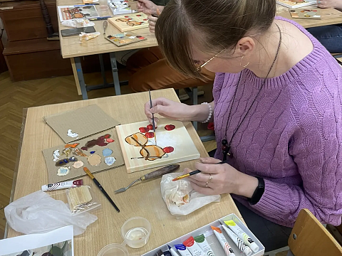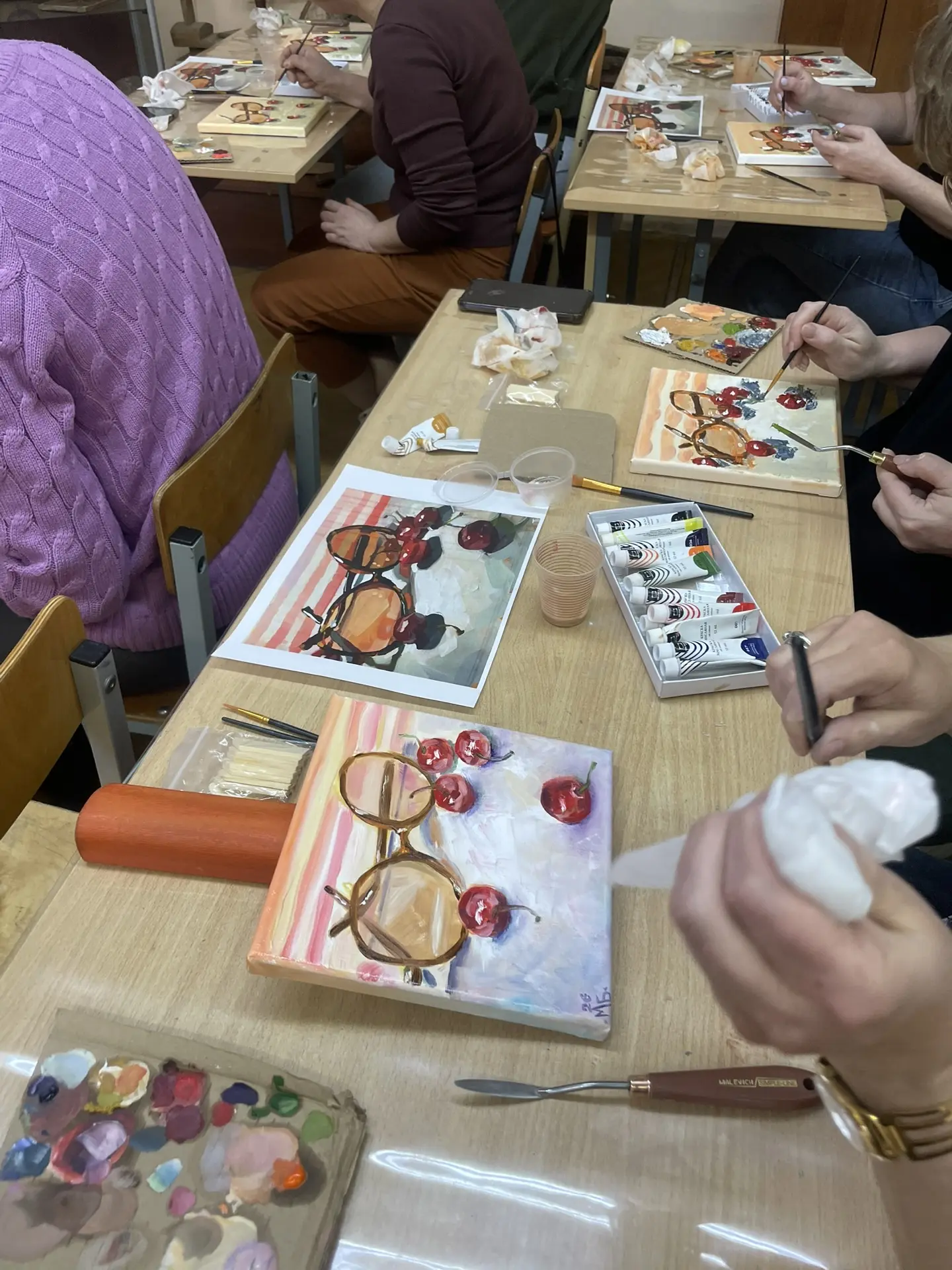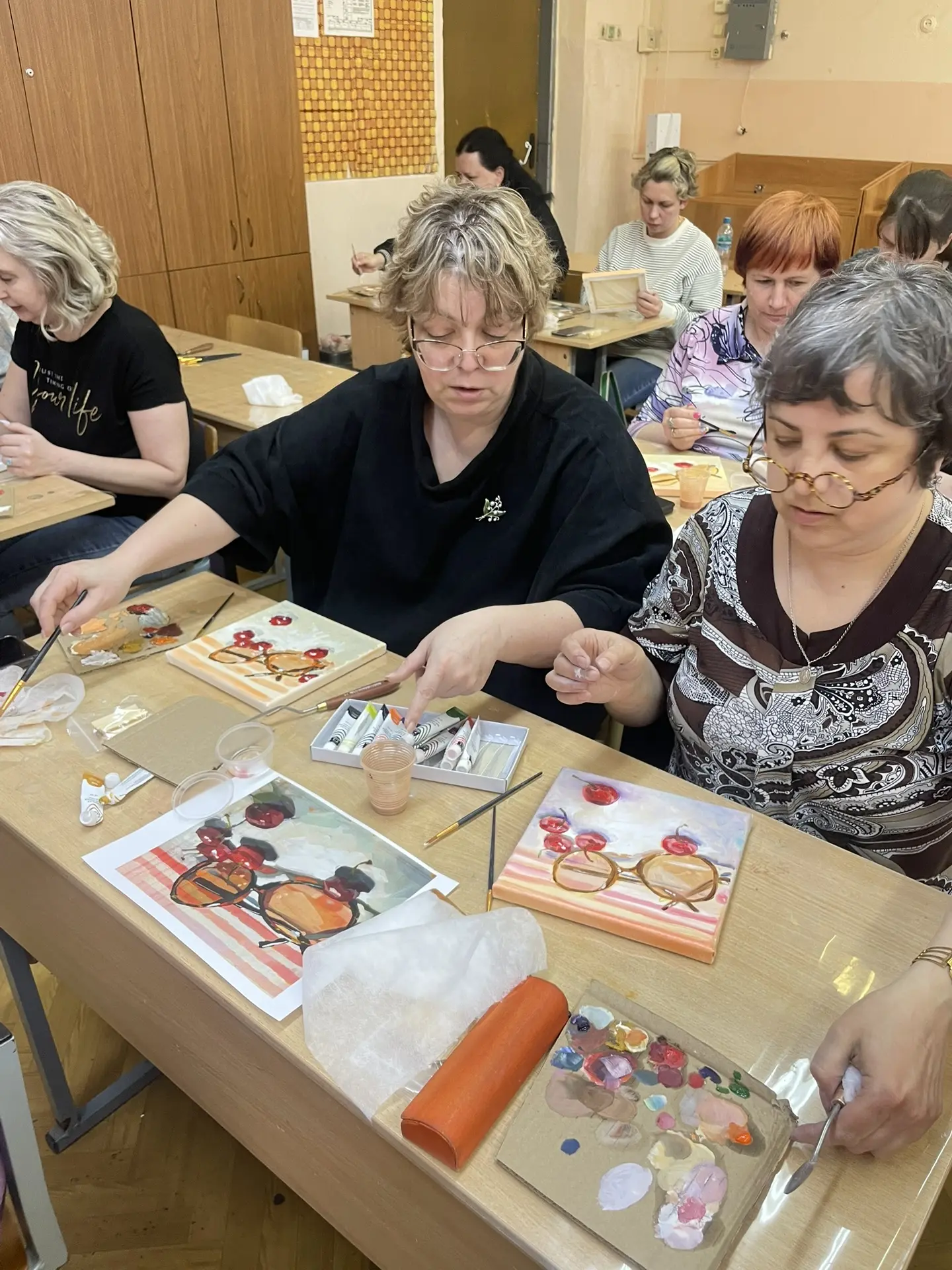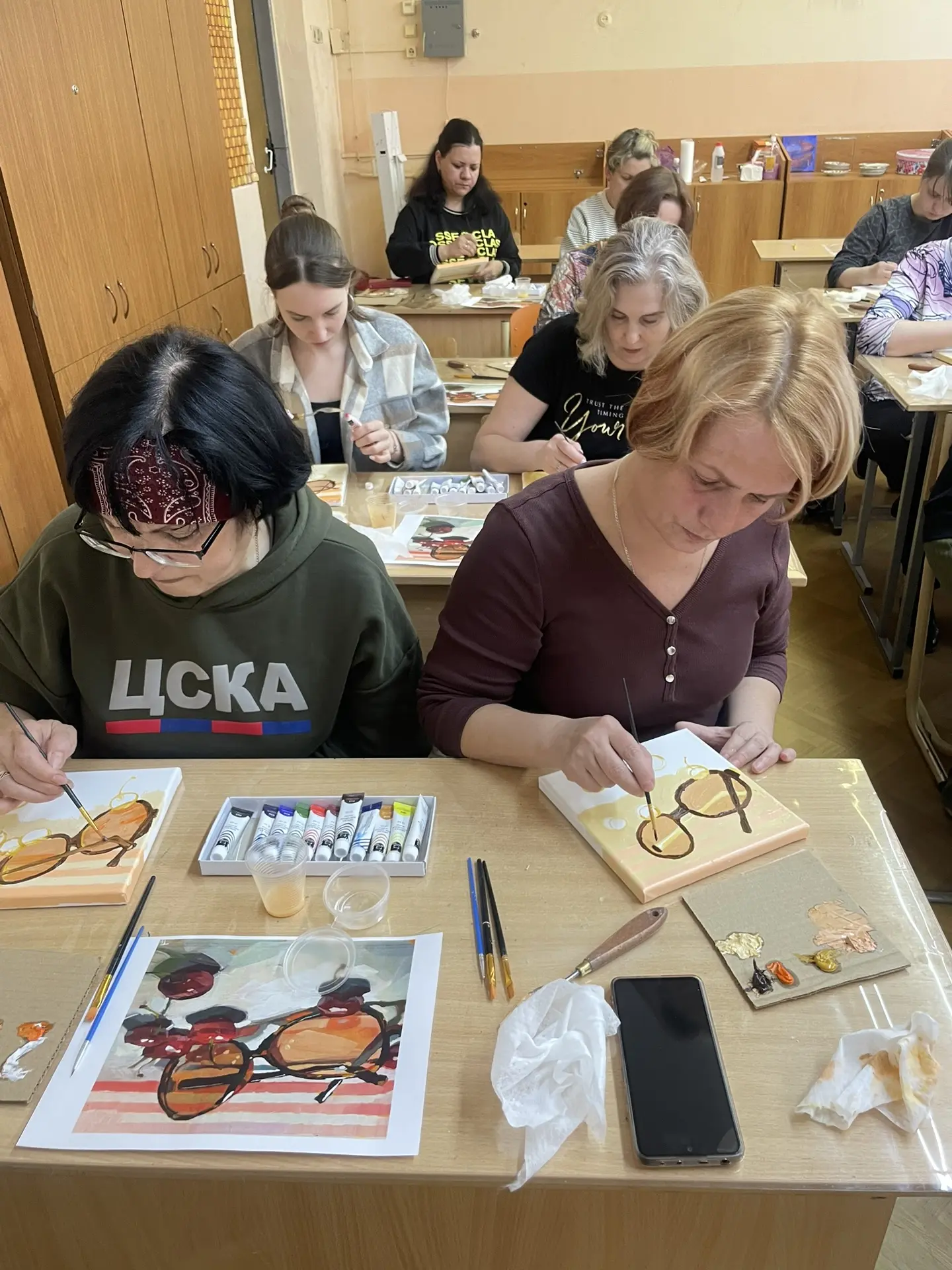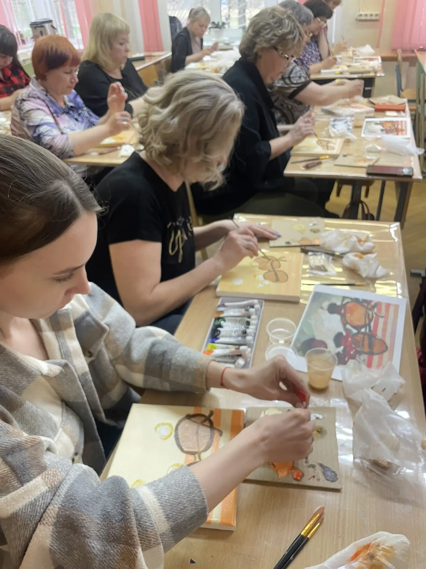 По многочисленным просьбам 15 апреля школа 38 вновь собрала членов профсоюза на гостевание "Женские радости". Тверская городская организация приготовила для встречи: холсты, масляные краски, кисти, короче, всё необходимое, входят участники. Кто-то из участников знаком с коллегами из других образовательных учреждений, а кто-то пришёл впервые, но атмосфера комфортная и доброжелательная.