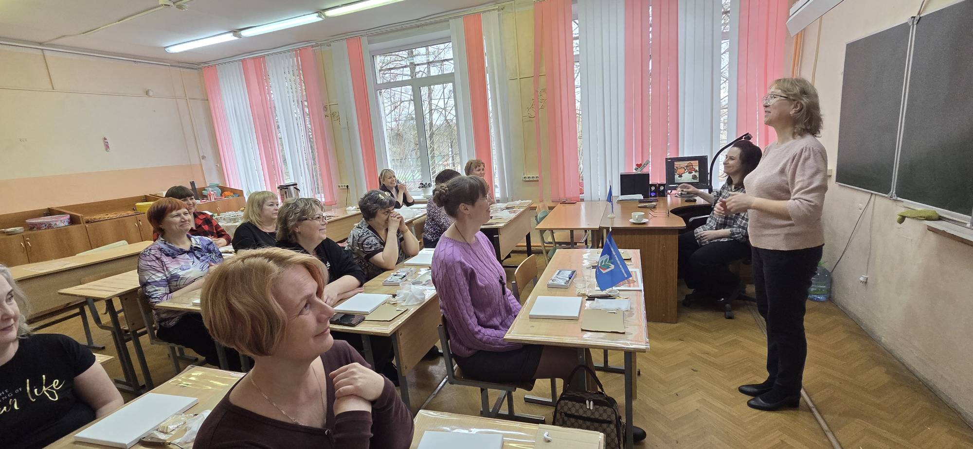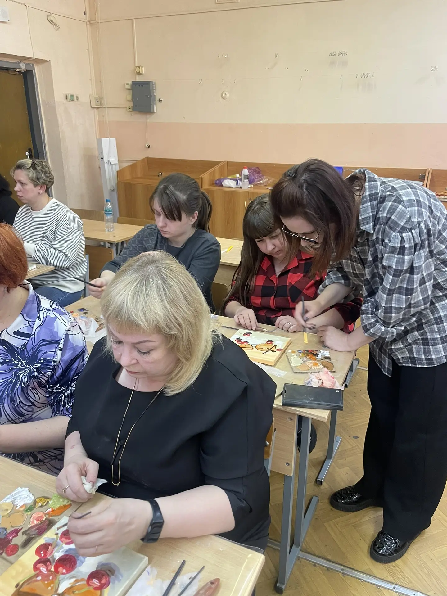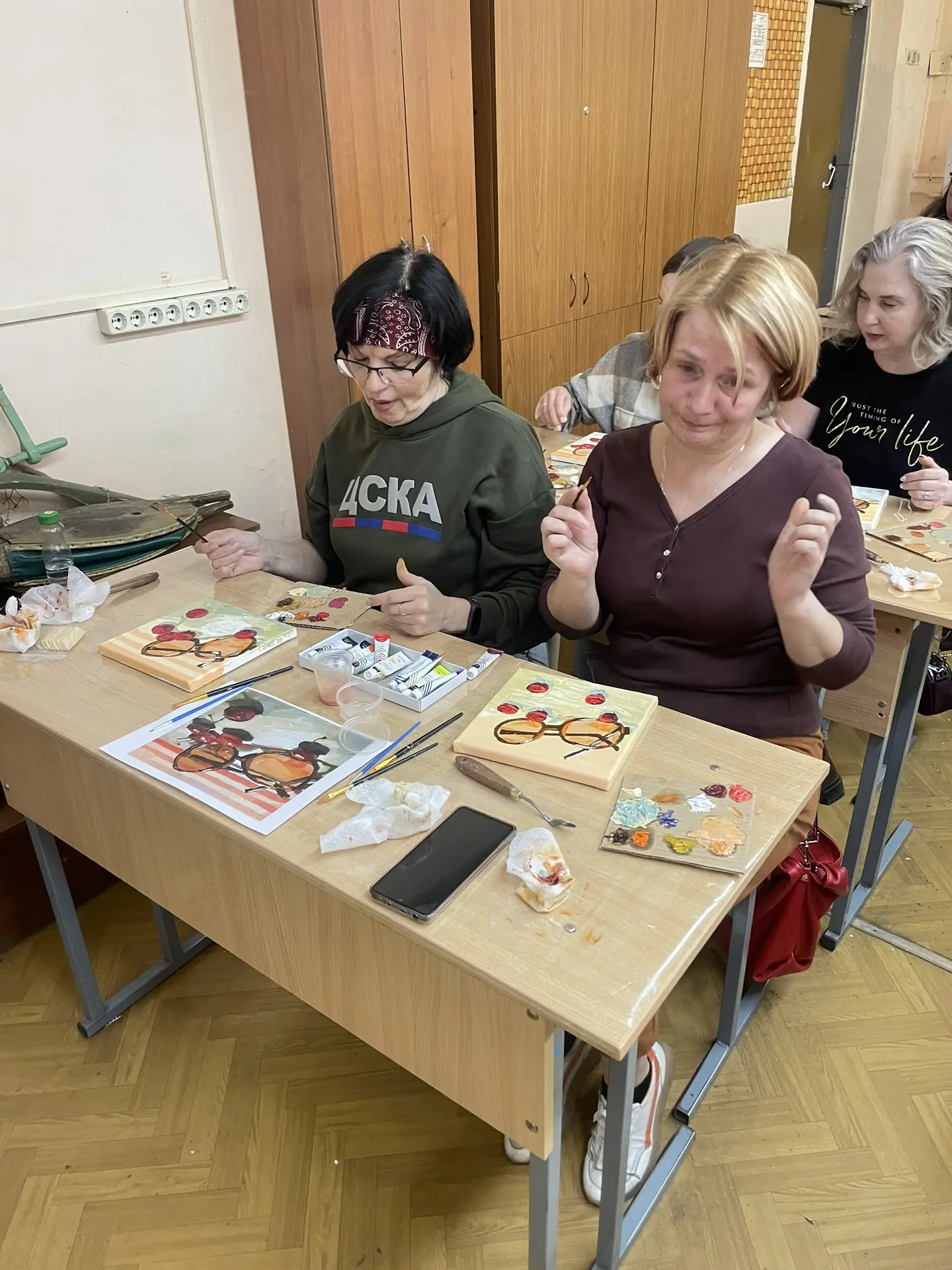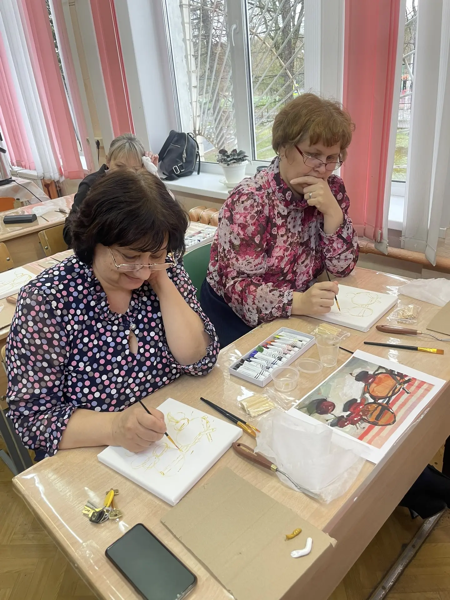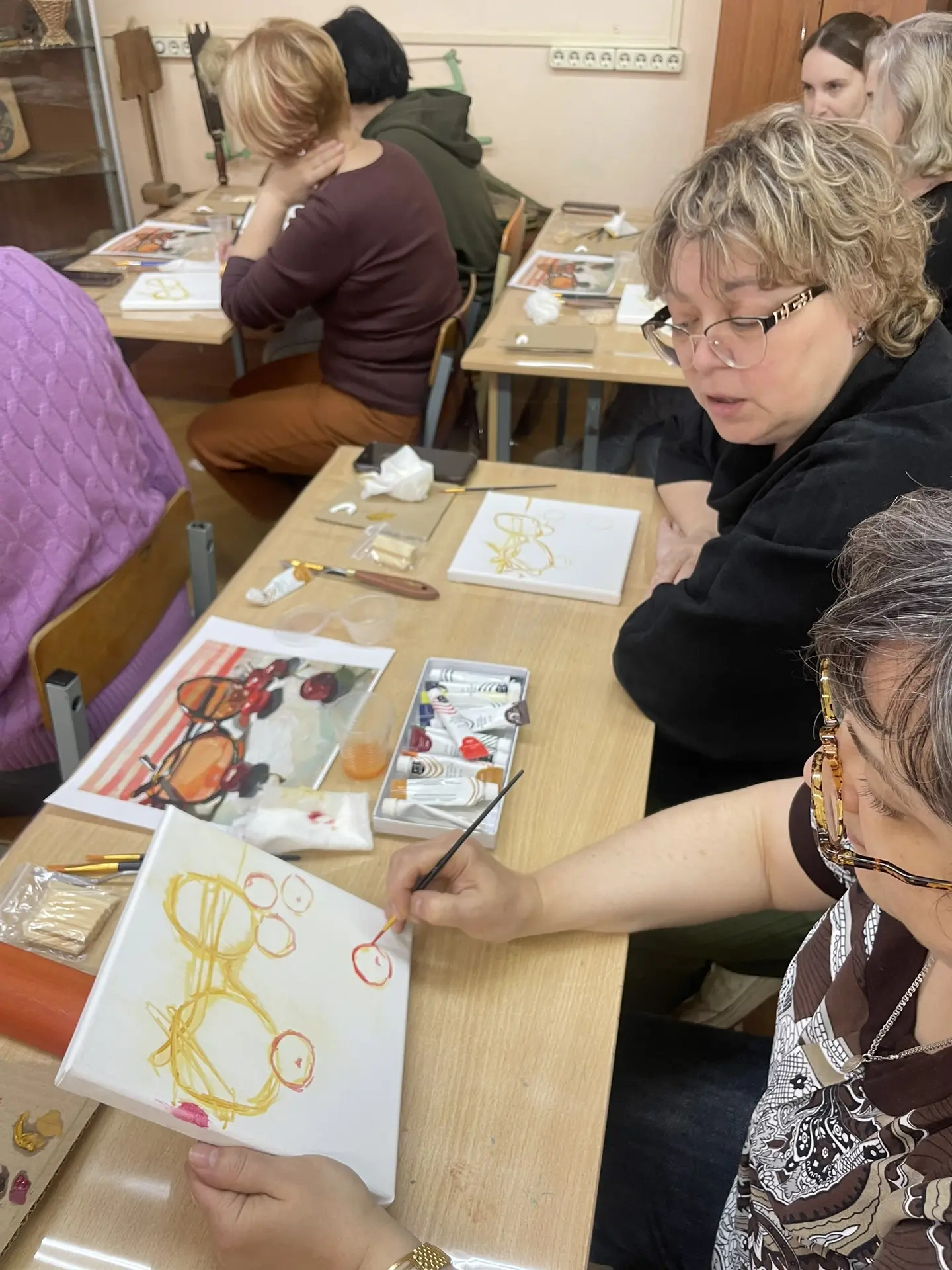 По многочисленным просьбам 15 апреля школа 38 вновь собрала членов профсоюза на гостевание "Женские радости". Тверская городская организация приготовила для встречи: холсты, масляные краски, кисти, короче, всё необходимое, входят участники. Кто-то из участников знаком с коллегами из других образовательных учреждений, а кто-то пришёл впервые, но атмосфера комфортная и доброжелательная.