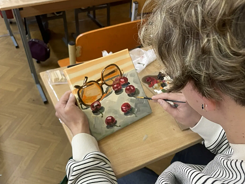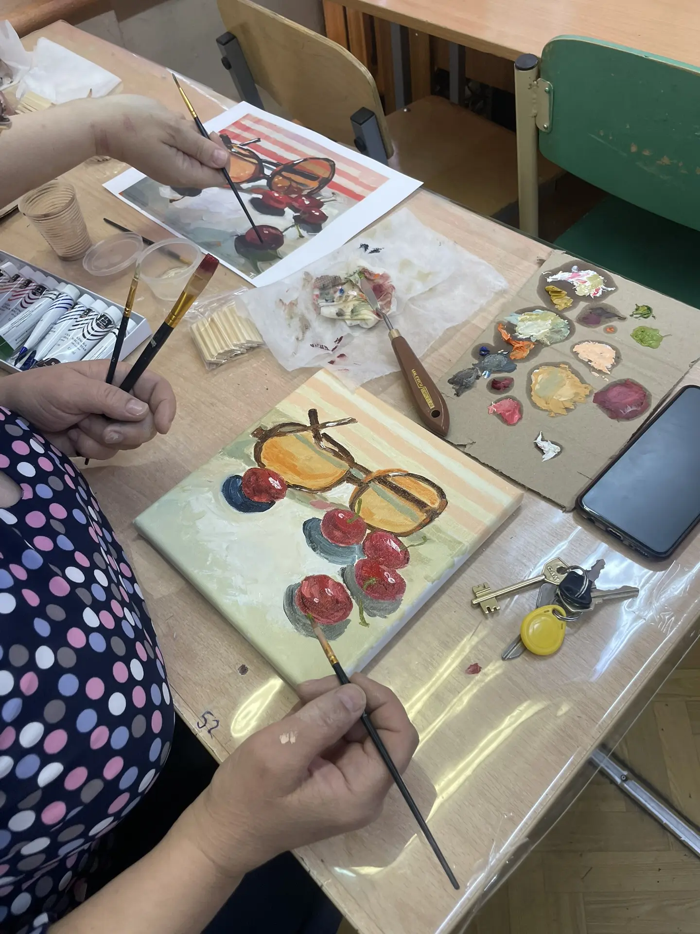 Лариса Михайловна Сидорова, председатель первичной профсоюзной организации МОУ СОШ 38 тепло поприветствовала всех участников и представила "бриллиант" школы- члена профсоюза Елену Леонидовну Коцюбинскую. И вот, отступать было некуда, приступили и постепенно на холстах стала вырисовываться желанная композиция, уверенности прибавлялось, весь мир остался где-то в стороне, вместе с заботами и тревогами... и откуда только всё это взялось в каждом участнике? Получилось у каждого!!! Удалось разгрузиться? Это 100 %! А в завершении чаепитие со вкуснейшим пирогом, который испекли школьные повара!