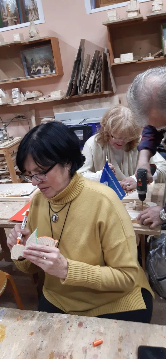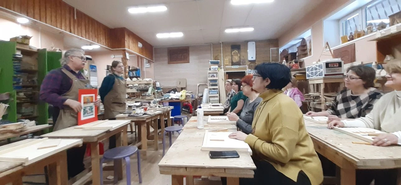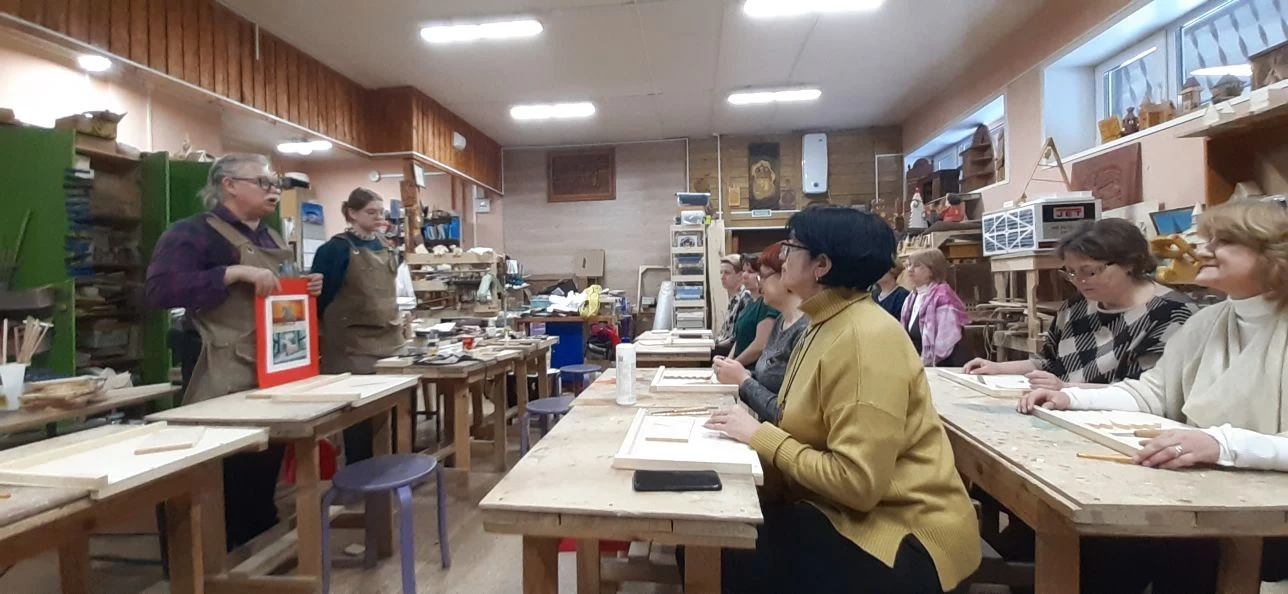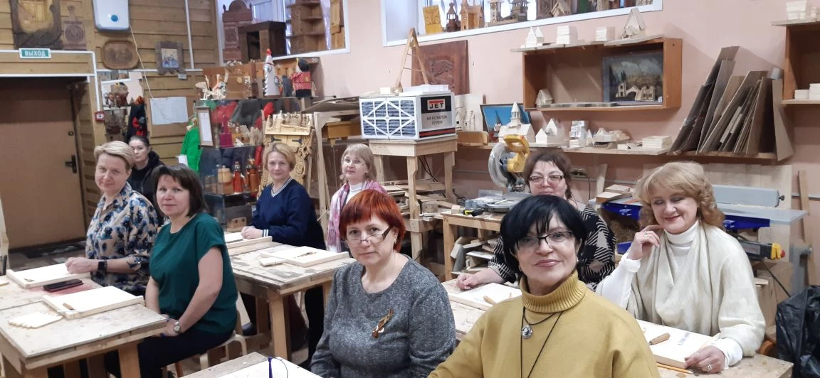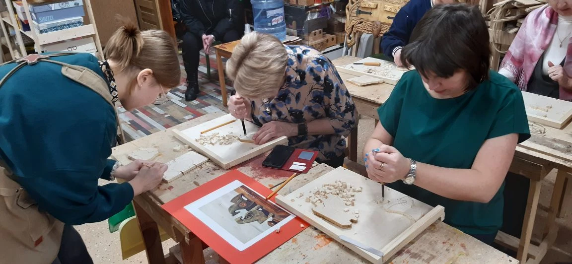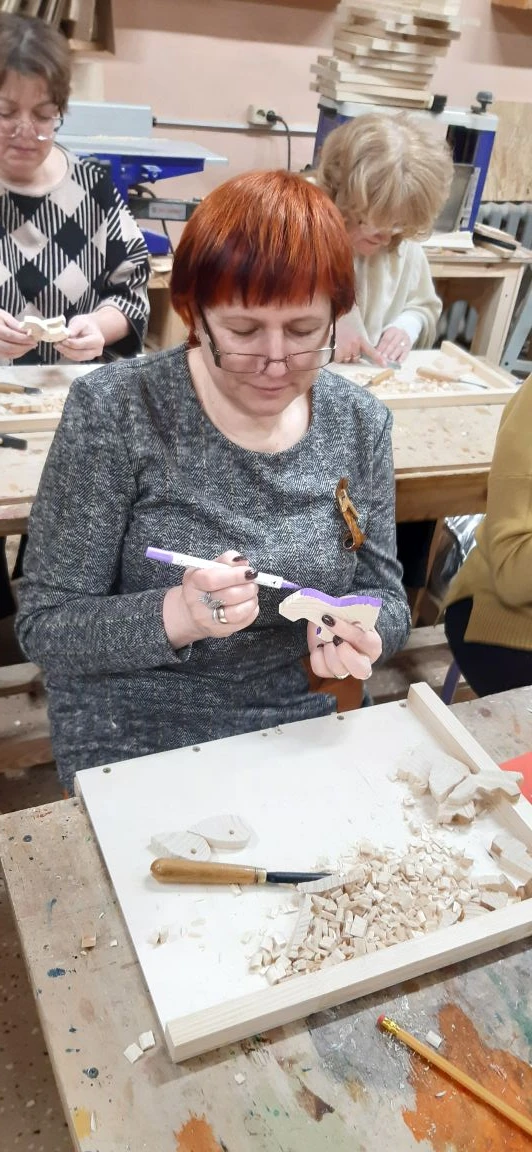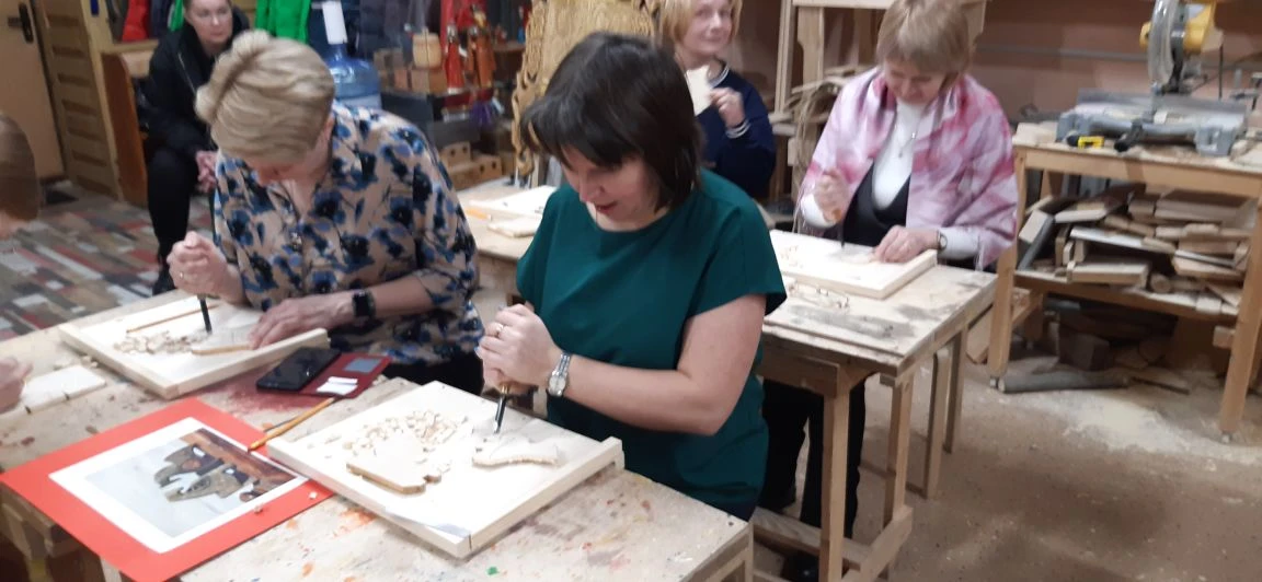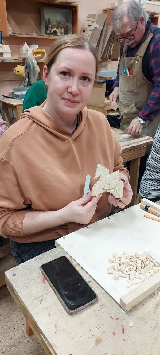 Великолепный мастер класс у Сергея Алексеевича Федотова «Коник с крыльями» в технике торцовой резьбы по дереву. Как только мы зашли в мастерскую, сразу запах дерева, такой уютный и настраивающий на релакс. Сомнения были, сможем ли резать по дереву, но у всех получилось.