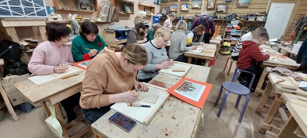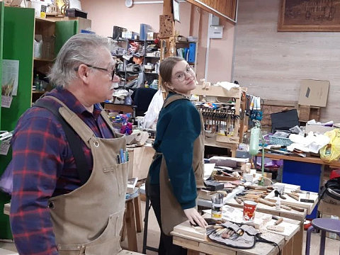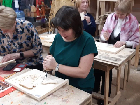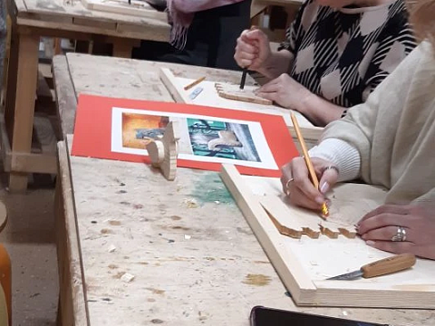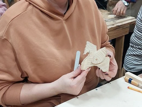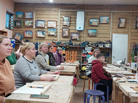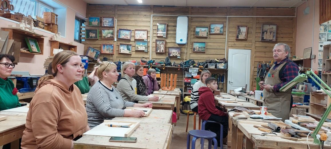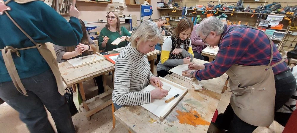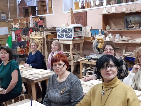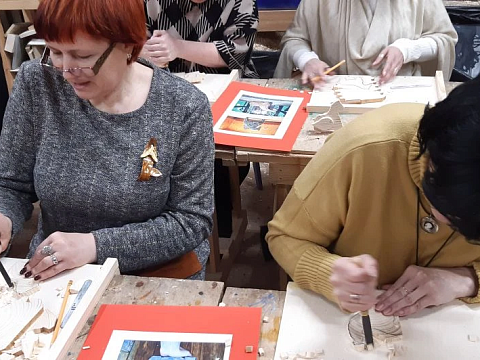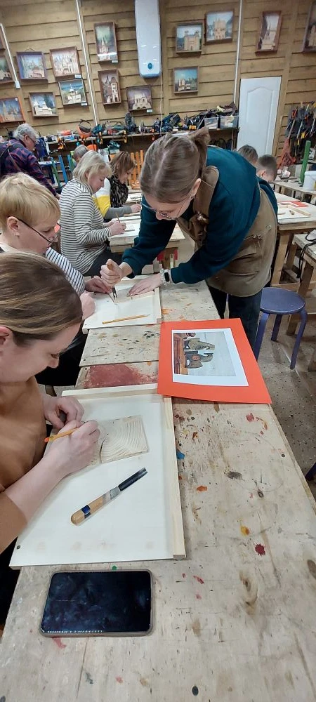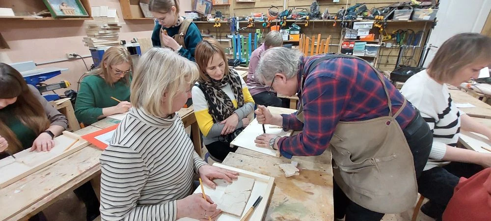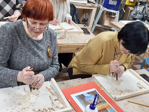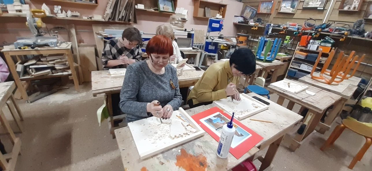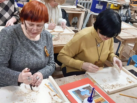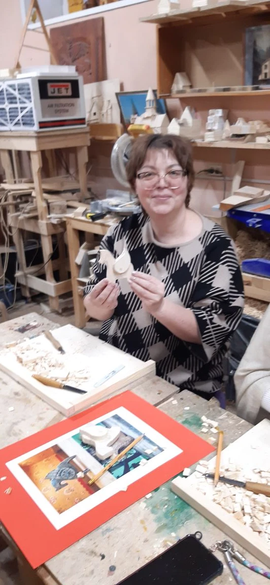 Великолепный мастер класс у Сергея Алексеевича Федотова «Коник с крыльями» в технике торцовой резьбы по дереву. Как только мы зашли в мастерскую, сразу запах дерева, такой уютный и настраивающий на релакс. Сомнения были, сможем ли резать по дереву, но у всех получилось.