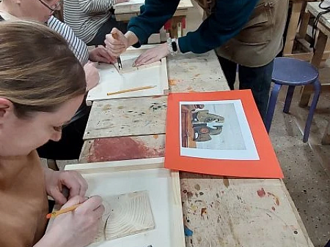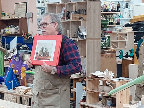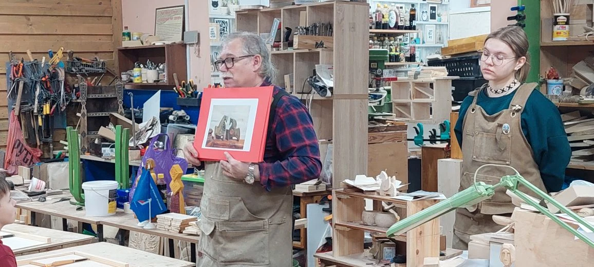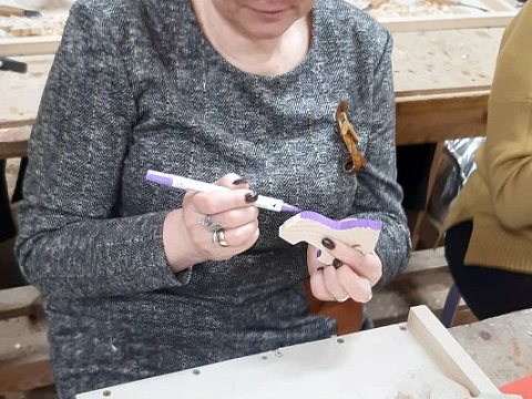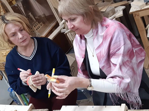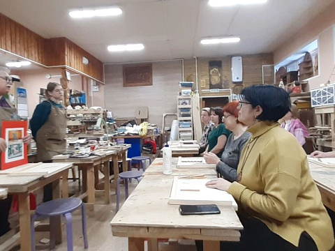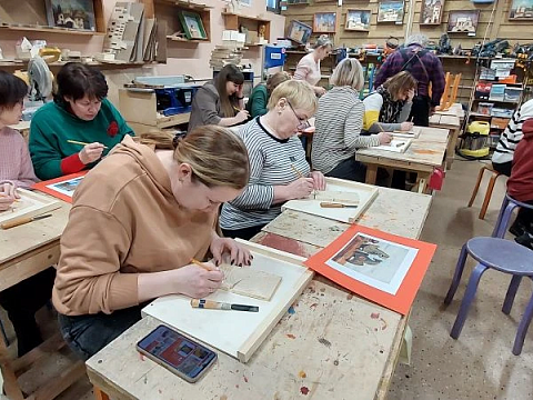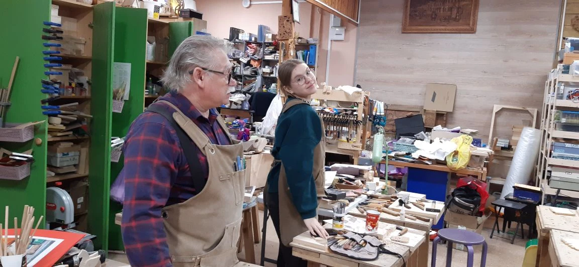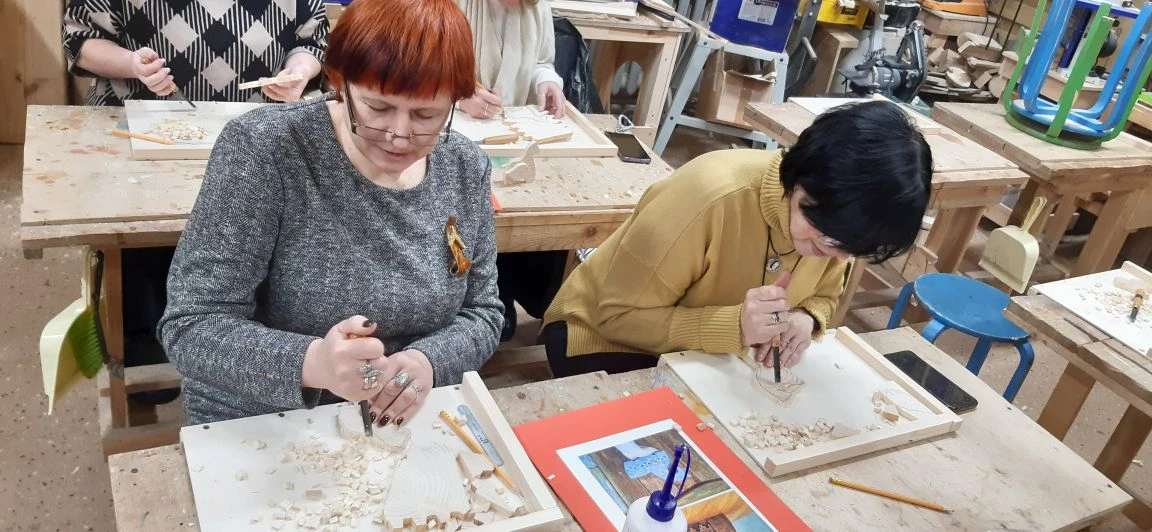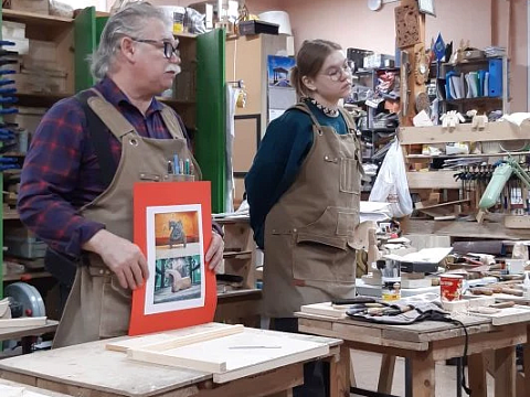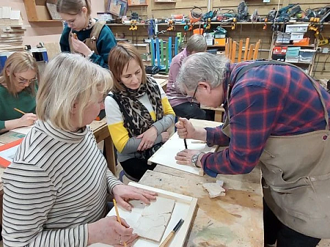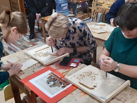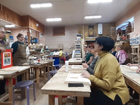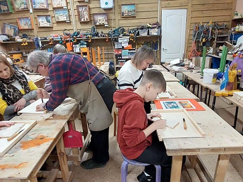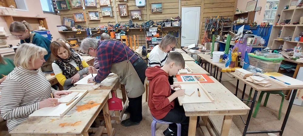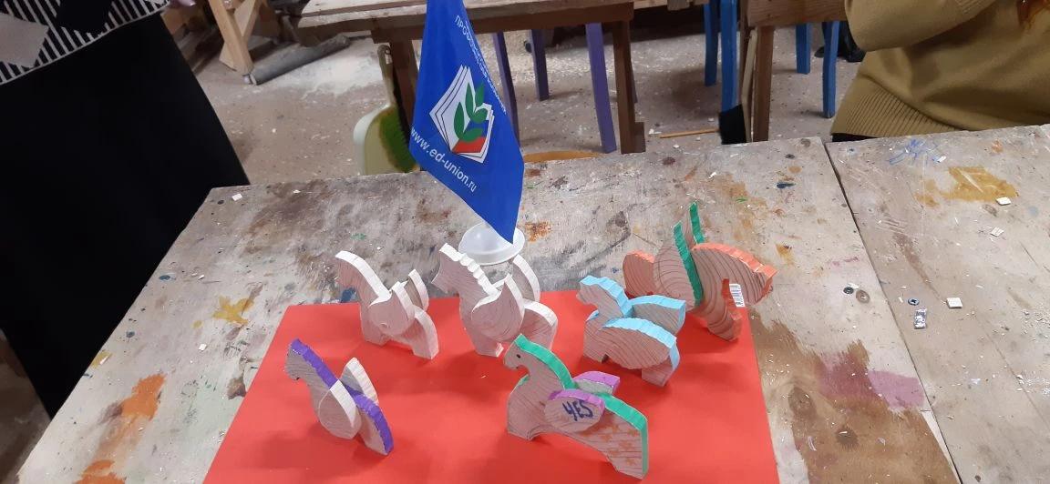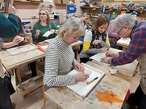 Великолепный мастер класс у Сергея Алексеевича Федотова «Коник с крыльями» в технике торцовой резьбы по дереву. Как только мы зашли в мастерскую, сразу запах дерева, такой уютный и настраивающий на релакс. Сомнения были, сможем ли резать по дереву, но у всех получилось.
