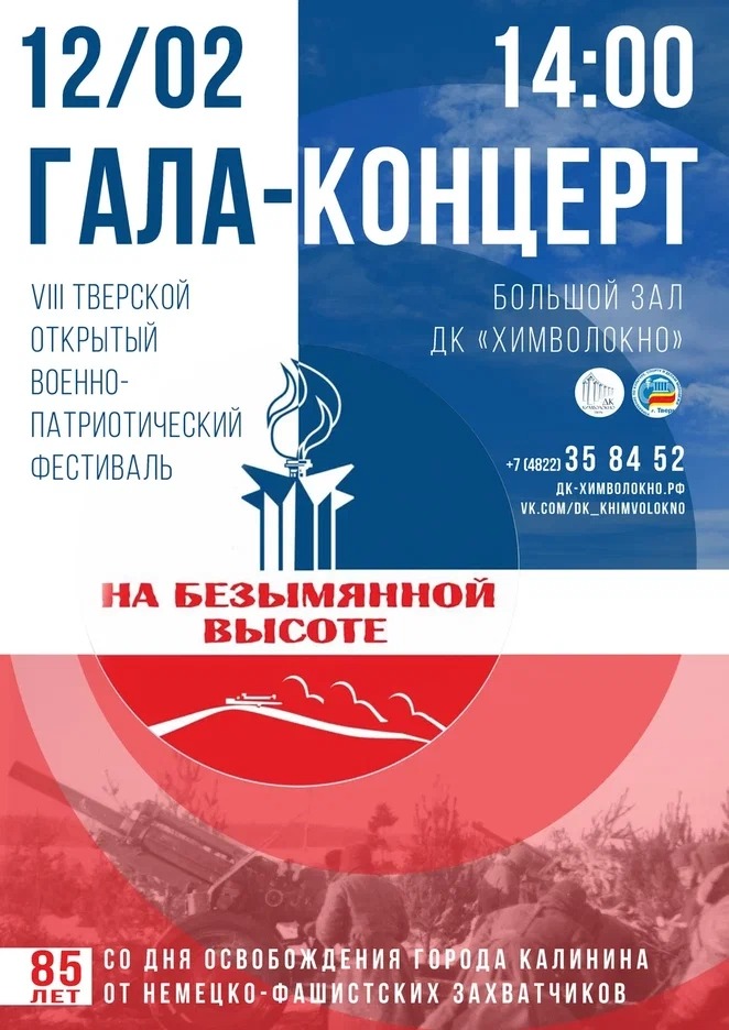 12 февраля в 14:00 в Концертном зале Дворца культуры «Химволокно» состоится Гала-концерт VIII Тверского открытого военно-патриотического фестиваля «На безымянной высоте».