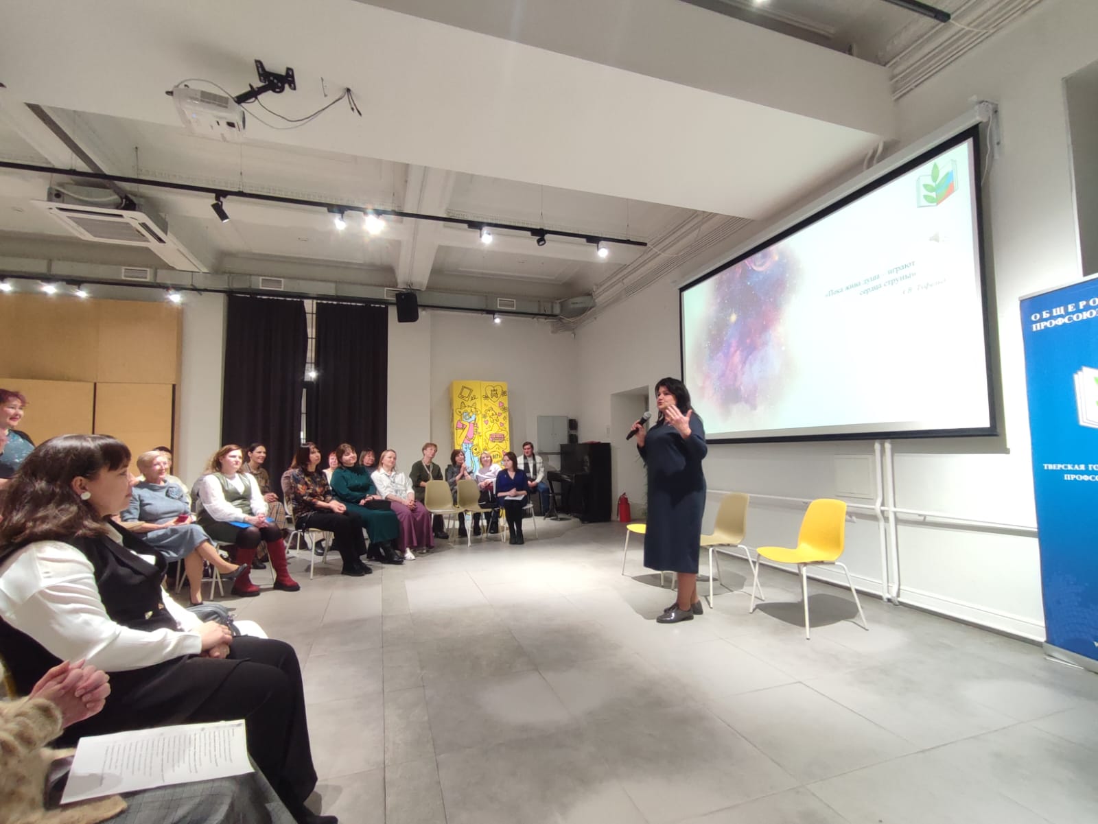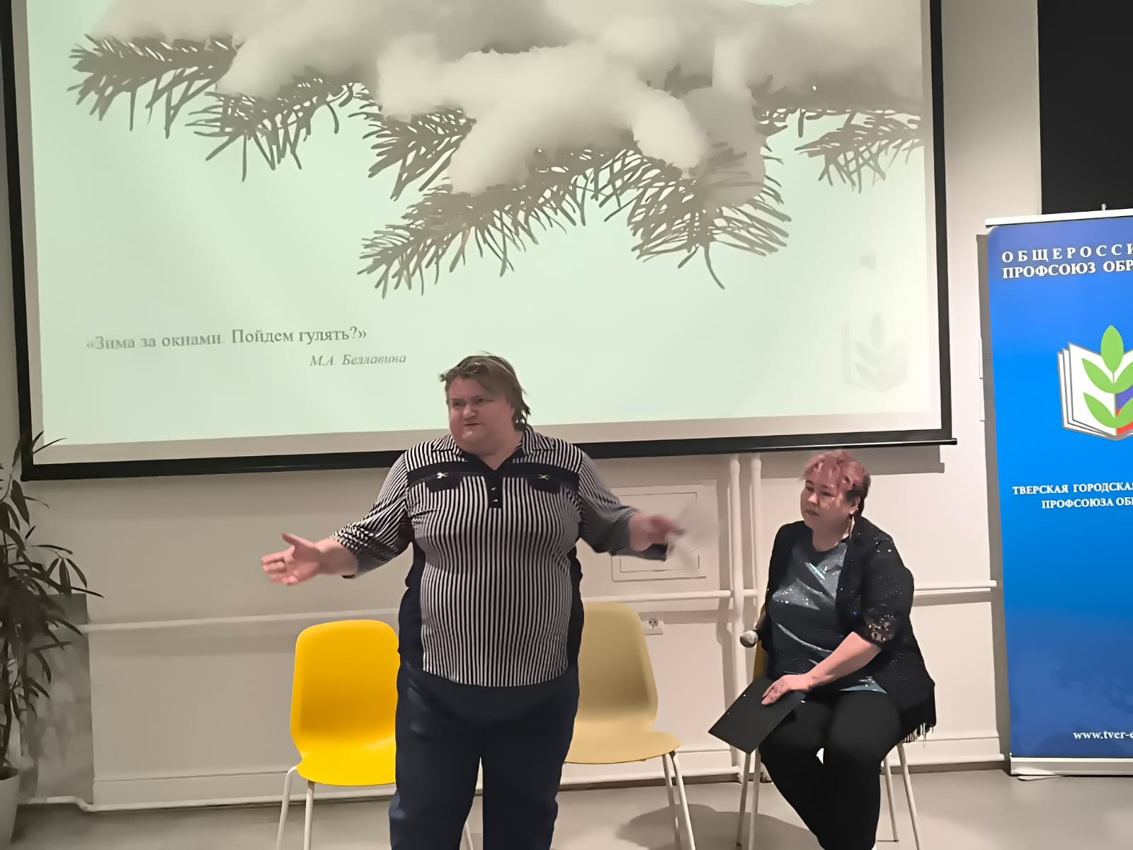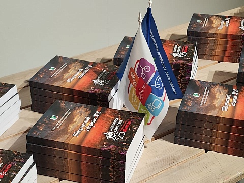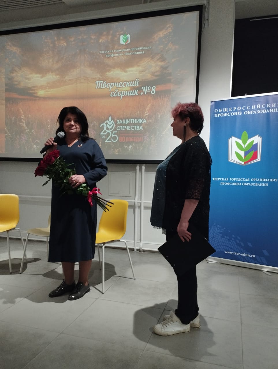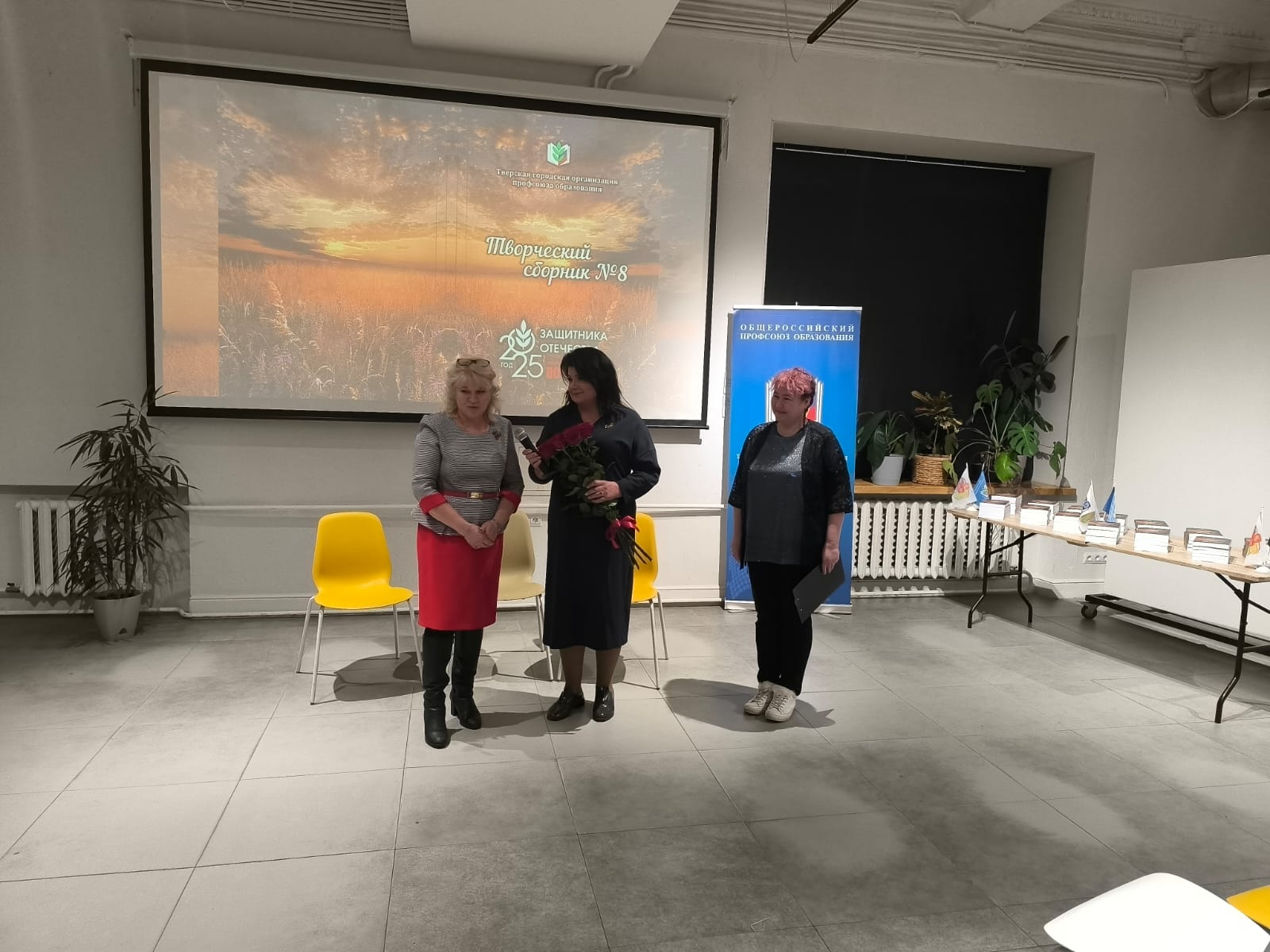 Просторный зал, высокие потолки, стулья полукругом, а на столах сбоку — стопки книг. Яркие переплёты манят взгляды собравшихся. На экране заставка: презентация восьмого творческого сборника Тверской городской организации профсоюза образования. Мягкий свет дружелюбно освещает пространство, на лицах людей удивление, сомнение, но и азарт: что будет? Что дальше?