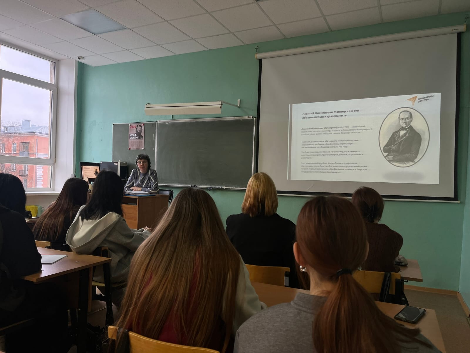 Советник директора по воспитанию, член профсоюза Кушникова К.А совместно с преподавателем математики, членом профсоюза Нюхляковой Н.А. провели тематическое занятие «Великие математики Тверской области». Первокурсники в рамках пары математики рассмотрели жизненный путь и достижения трёх выдающихся деятелей: Владимира Модестовича Брадиса, Леонтия Филипповича Магницкого и Павла Петровича Коровкина. Студенты узнали об их вкладе в науку, образование и общественную жизнь, что подчёркивает важность их наследия для Тверской области и всей страны.