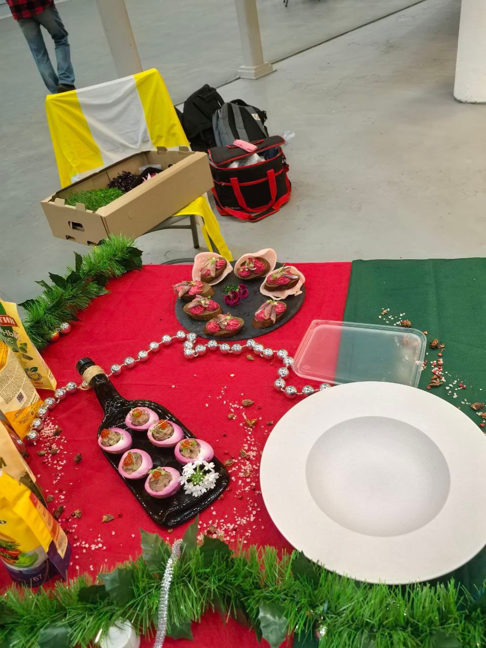 Создать банкетную версию на 6 персон, оформленную в стилистике зимнего праздника и национальной идентичности.