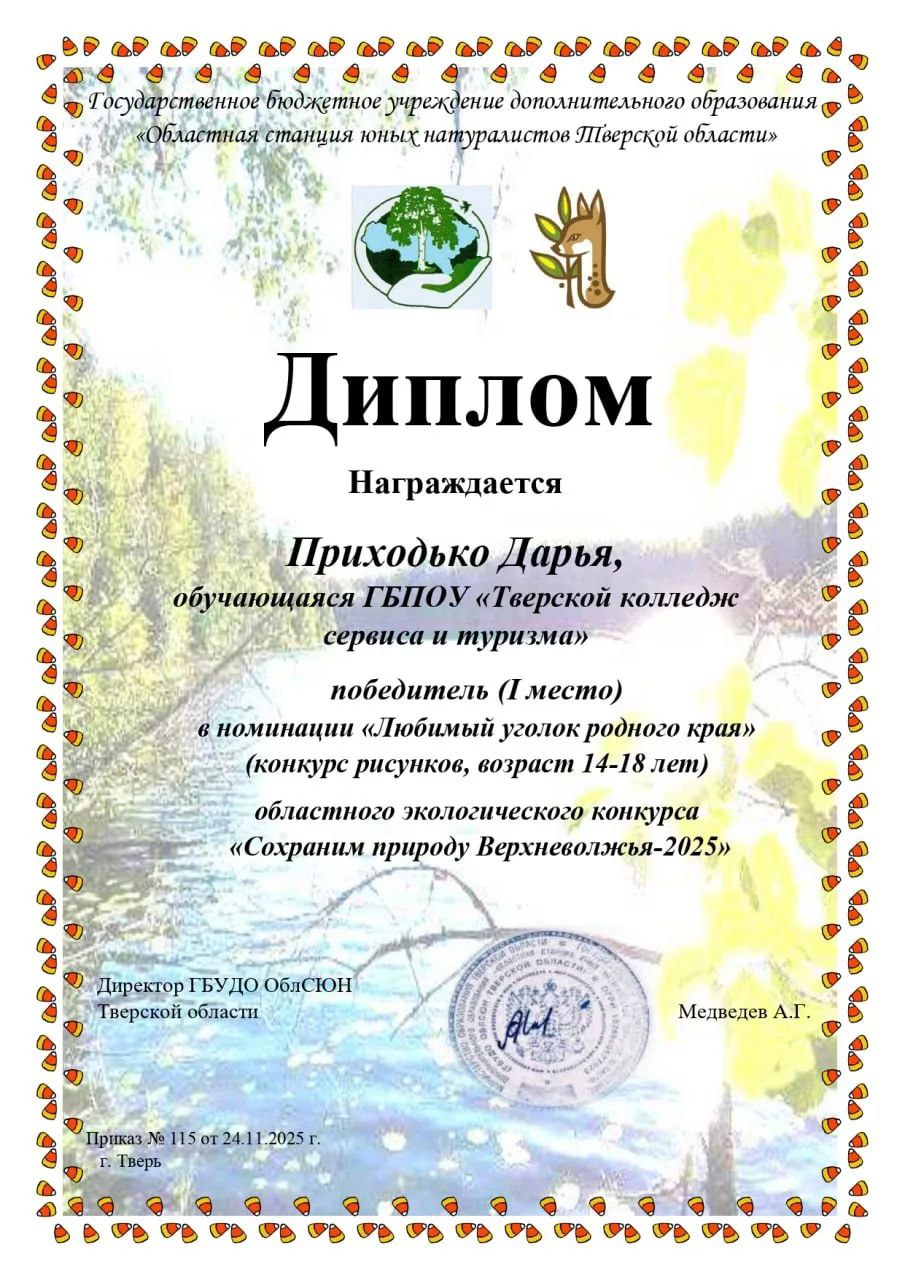 01 декабря 2025 года стали известны итоги областного экологического конкурса "Сохраним природу Верхневолжья - 2025" студентка нашего колледжа Приходько Дарья под руководством преподавателя, члена профсоюза Крюковой Оксаны Юрьевны заняла 1 место в номинации "Любимый уголок родного края". Дарья дала своей работе название "Место силы", отразив важность и глубину воздействия родной природы на человека.