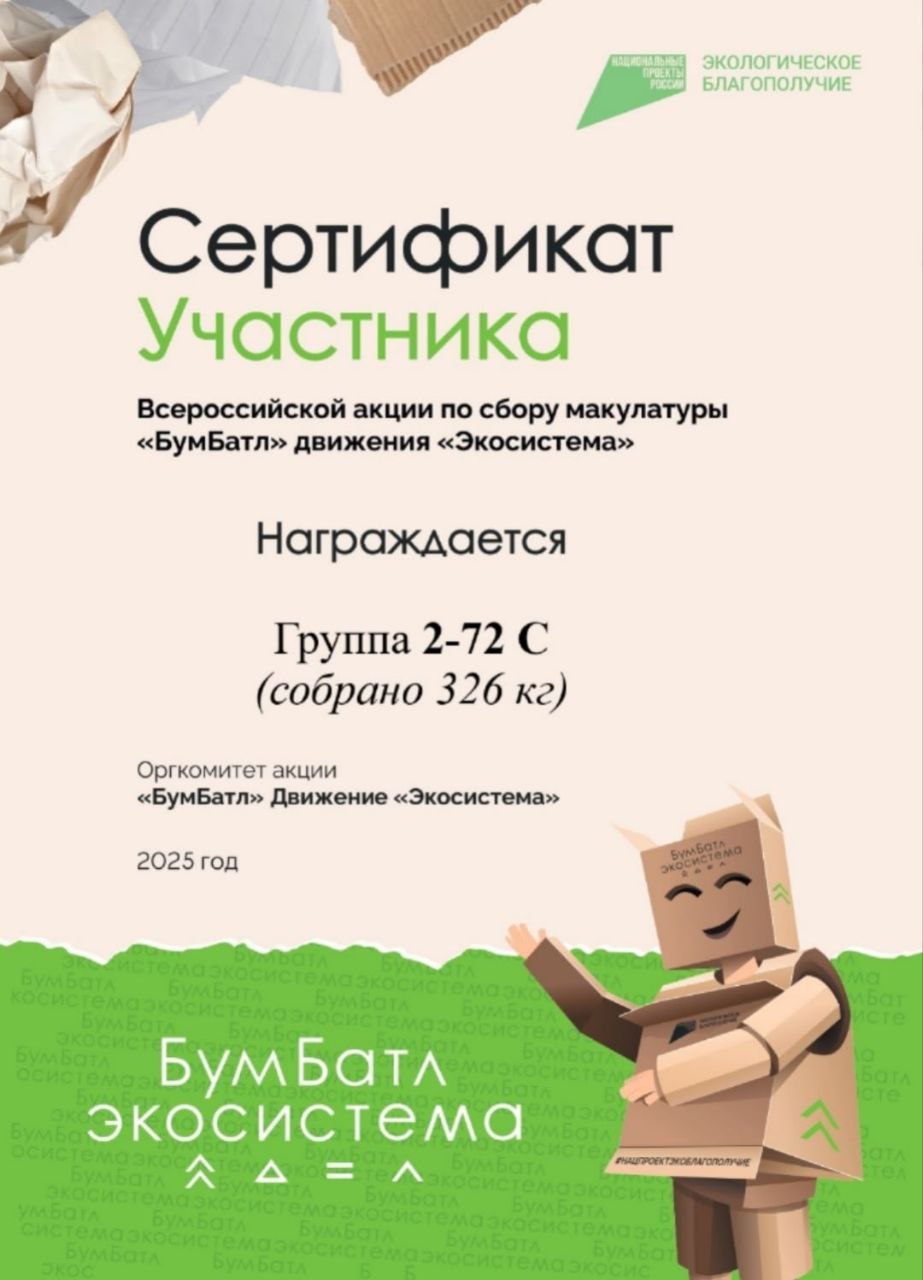 04.12.2025 В поддержку национального проекта "Экологическое благополучие" коллектив преподавателей и студентов нашего колледжа приняли участие во Всероссийской акции "БумБатл". Общими усилиями собрано и сдано на утилизацию 1337 кг макулатуры. Абсолютными лидерами по количеству сданной макулатуры стали студенты учебной группы 2-72С (их рекорд 326 кг) под руководством кураторов, членов профсоюза Мисуно Марины Германовны и Прасловой Анастасии Игоревны. Все участники получили сертификаты, а победители будут награждены подарками.