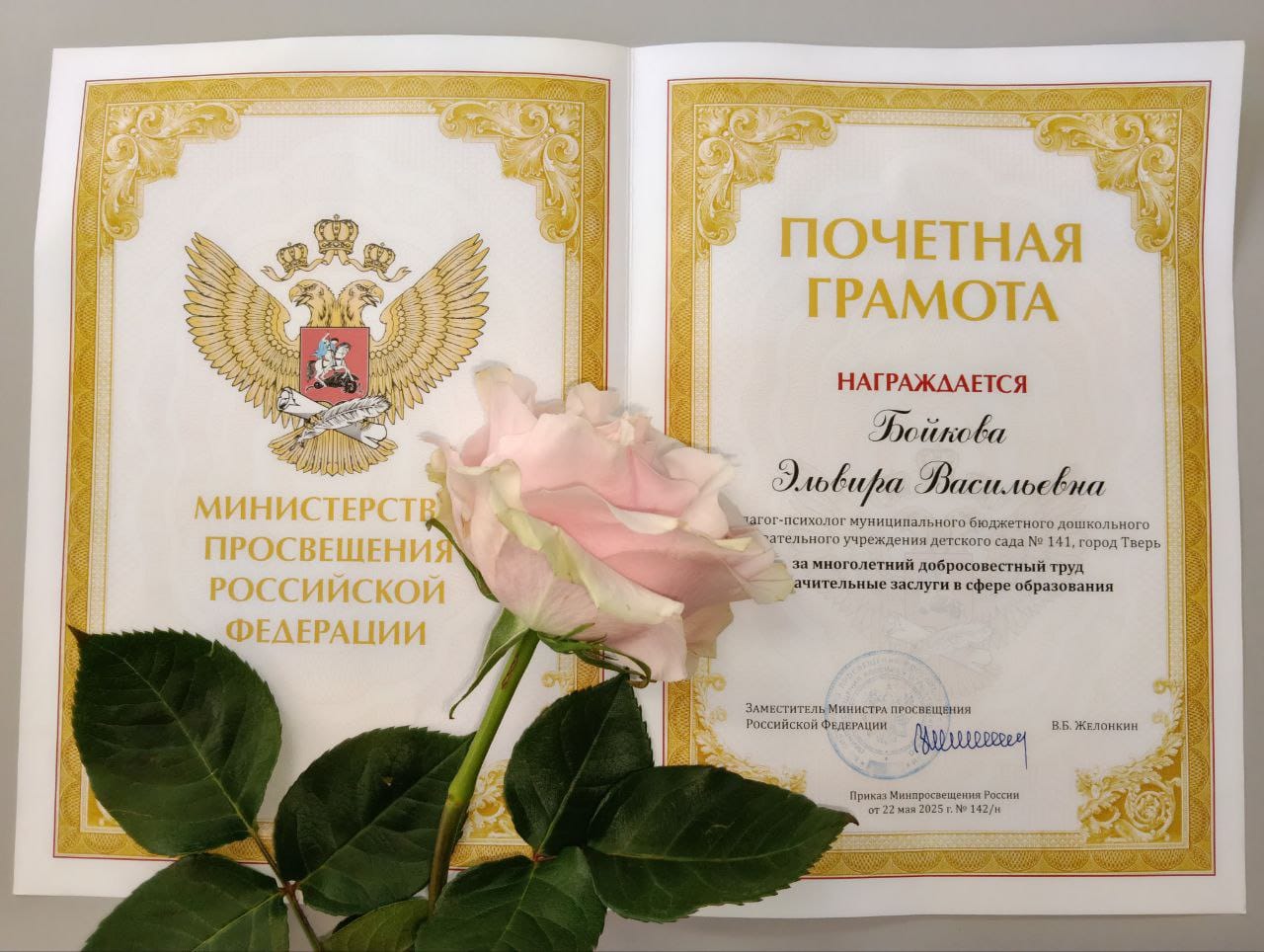 За многолетний добросовестный труд и значительные заслуги в сфере образования Почётной грамотой Министерства Просвещения РФ была награждена педагог-психолог, член профсоюза Бойкова Эльвира Васильевна.