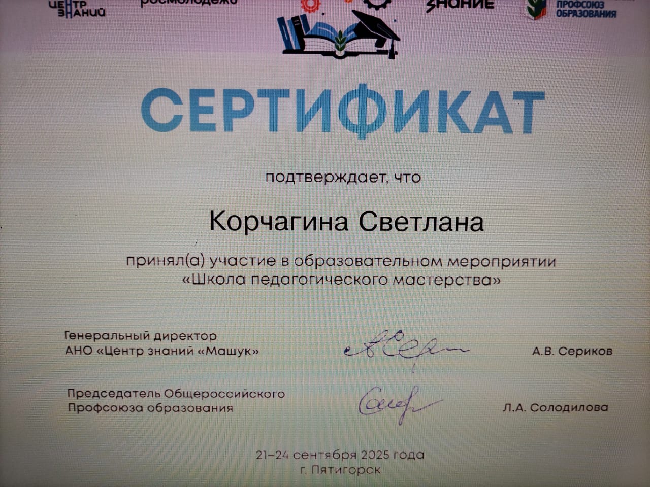 Учитель, член профсоюза Корчагина Светлана прошла курсы Центр знаний Машук.