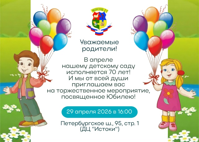 "С радостью приглашаем вас на торжественный концерт, посвященный 70-летнему юбилею нашего детского сада! Юбилейный концерт состоится: 29 апреля в 16:00 часов в ДЦ "Истоки" (Петербургское ш., д. 95, стр. 1). С нетерпением ждем вас! Будем счастливы видеть вас среди гостей нашего праздника!"